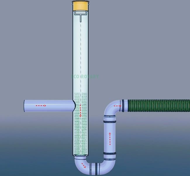 - teava de intrare de 110mm/teava iesire 110mm pentru deversarea in drenaj subteran care poate fi cu tub de drenaj sau tunele de percolare
